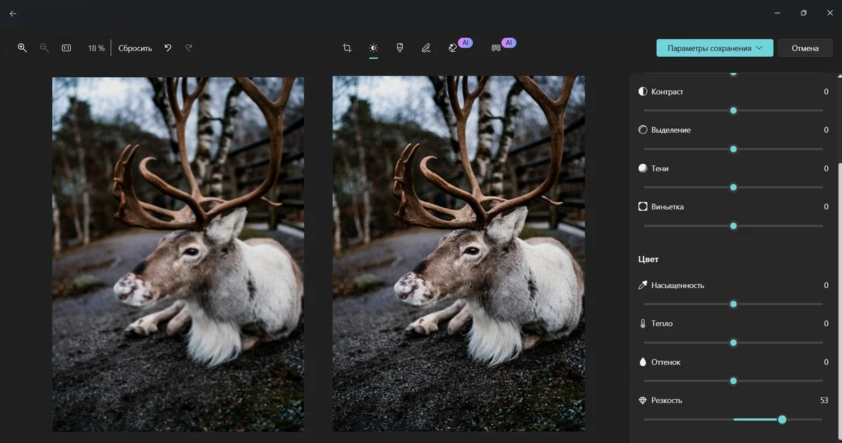 Откройте кадр через штатный просмотрщик, нажмите «Изменить» и перейдите в раздел «Настройка». Задействуйте ползунок «Резкости». Этот способ не справится с сильной смазанностью, но идеален для коррекции небольших дефектов. Лучше сохранять результат как копию файла, чтобы не перезаписывать оригинал.