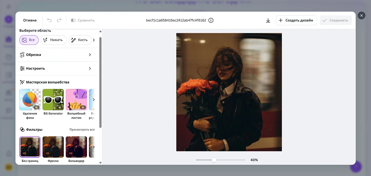 Это большая платформа для создания графического контента. Ее часто включают в топ онлайн фоторедакторов, поскольку она многофункциональная. Есть режимы для создания презентаций, онлайн-досок, контента для соцсетей и др. В разделе для снимков можно сделать цветокоррекцию с помощью фильтров и бегунков, обрезать картинку, сделать автоматическую ретушь и т. д. Также вы можете создать новый дизайн и добавить на картинку текст, графические элементы.