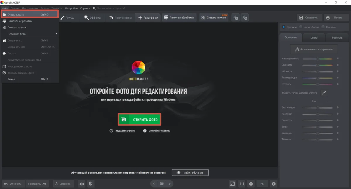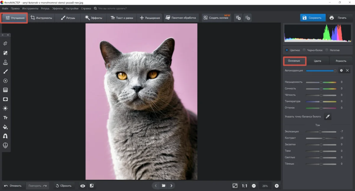2. Выполните цветокоррекцию. Для этого перейдите во вкладку «Улучшения» и отрегулируйте параметры. Для быстрого результата воспользуйтесь автоматической функцией.
