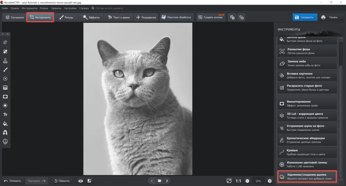 3. Добавьте эффект в блоке «Инструменты» или фильтр в «Эффектах», отрегулируйте интенсивность воздействия эффекта на фото.