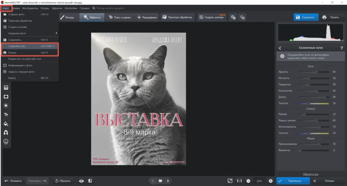 ФотоМАСТЕР можно использовать в качестве программы для создания афиш не только для интернет-публикаций, но и последующей печати. Для этого следует указать разрешение — низкое, среднее или премиум, поля и маркеры для обрезки, выбрать размер бумаги. Редактор имеет понятное рабочее поле на русском языке, поэтому он отлично подойдет пользователям без опыта в оформлении дизайна, будь то стенгазета, наружная реклама для заведения у входа, меню.