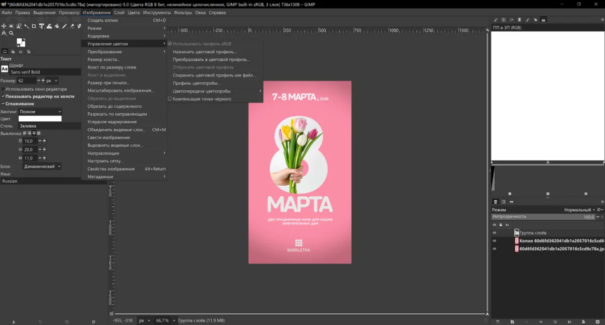Бесплатная программа для создания постеров и плакатов с тонкой настройкой цветового профиля. Его можно выбрать из встроенных вариантов GIMP или загрузить из компьютера или внешнего накопителя файл в формате ICC. Благодаря этой опции пользователь может скорректировать палитру оттенков как для распечатки, так и для последующей публикации в сети.