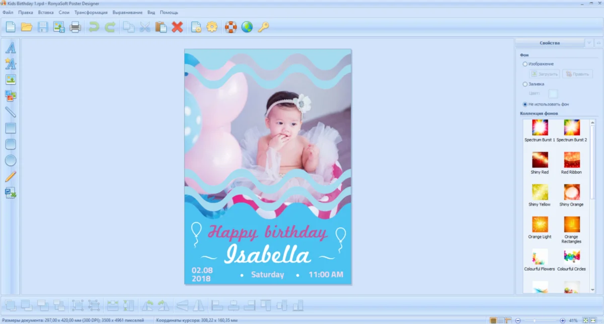 RonyaSoft Poster Designer подходит для быстрого и несложного оформления широкоформатной продукции. Софт предлагает более 500 дизайн-макетов при установке, а на сайте разработчика периодически выходят обновления с новыми заготовками. Но в отличие от предыдущих вариантов в RonyaSoft Poster Designer нет инструментов для продвинутых манипуляций с иллюстрациями, а базовая включает кадрирование и поворот. Весьма скудный выбор шрифтов для кириллицы, контент больше ориентирован на западный рынок.