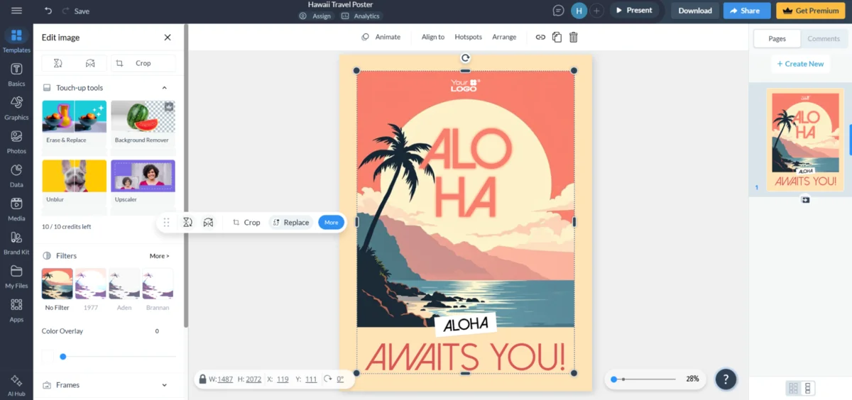 Онлайн-инструмент дает доступ к обширной библиотеке из тысяч профессиональных шаблонов. В готовом макете легко менять заголовки, описание, фон, добавлять логотип, загружать свой или использовать сервисный контент. Fotor позволяет скачивать дизайн в высоком качестве для полиграфической печати на стенде.