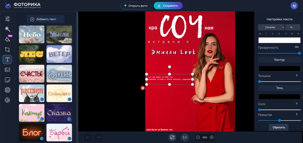 - расширенные текстовые возможности — изменение длины букв, расстояния между символами, заливка подложки, контуринг;