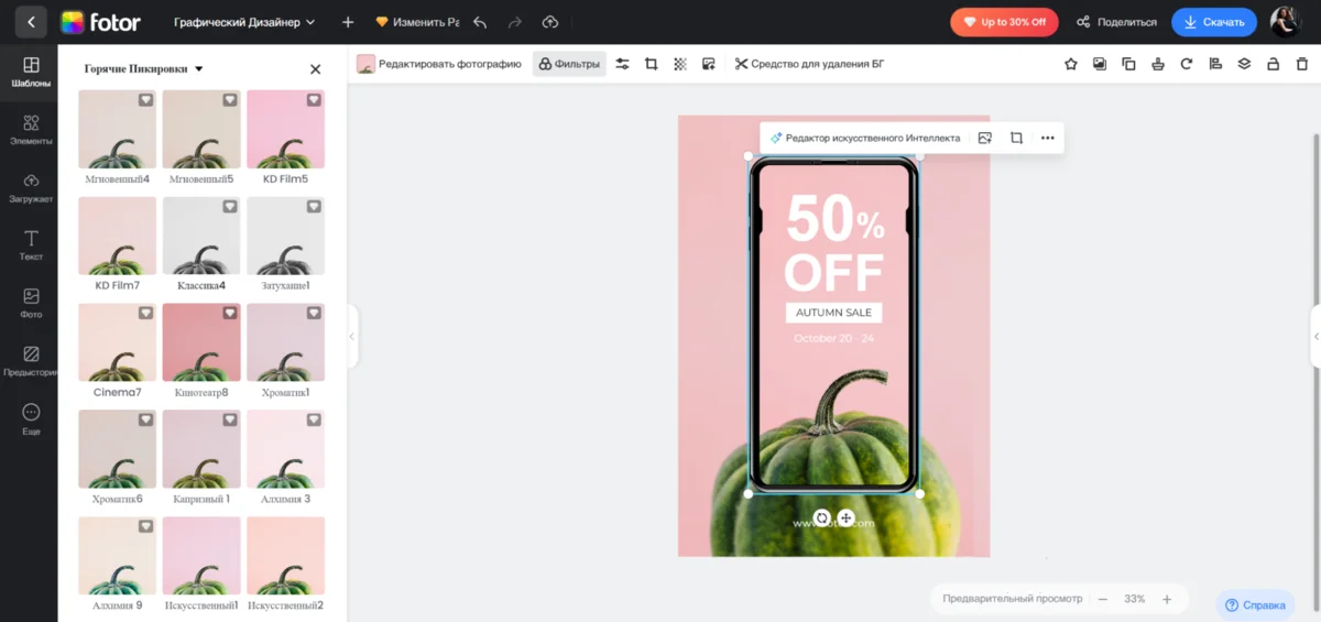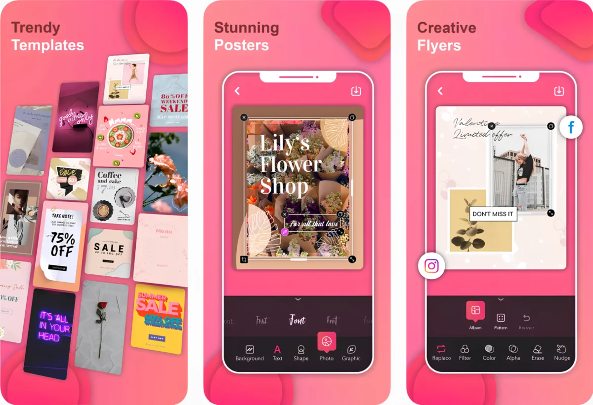 Для экспресс-дизайна баннеров и рекламных креативов можно смело воспользоваться функционалом мобильных приложений для создания постеров. Они не заменят профессиональные ПО в части детальной ретуши, но зато хорошо справляются с несложными задачами — убрать задний план, скорректировать описание, выбрать цветовую палитру. Ниже — мини-конструкторы с готовыми тематическими решениями.