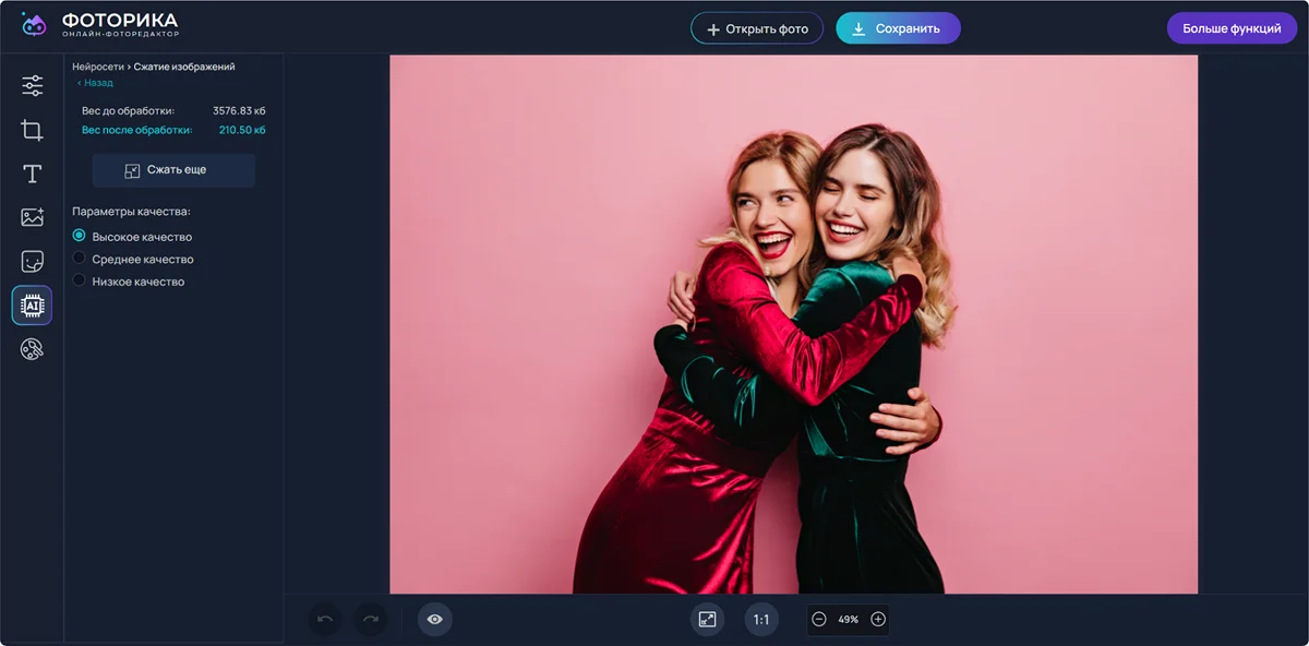 Онлайн-редактор с большим арсеналом AI-возможностей для фотомонтажа. Сервис популярен не только среди обычных пользователей, но и у маркетологов, менеджеров маркетплейсов, блогеров. Рядом с командой сжимания на левой боковой панели находятся другие полезные возможности — кадрирование, удаление фона, работа с размерами, конвертация.