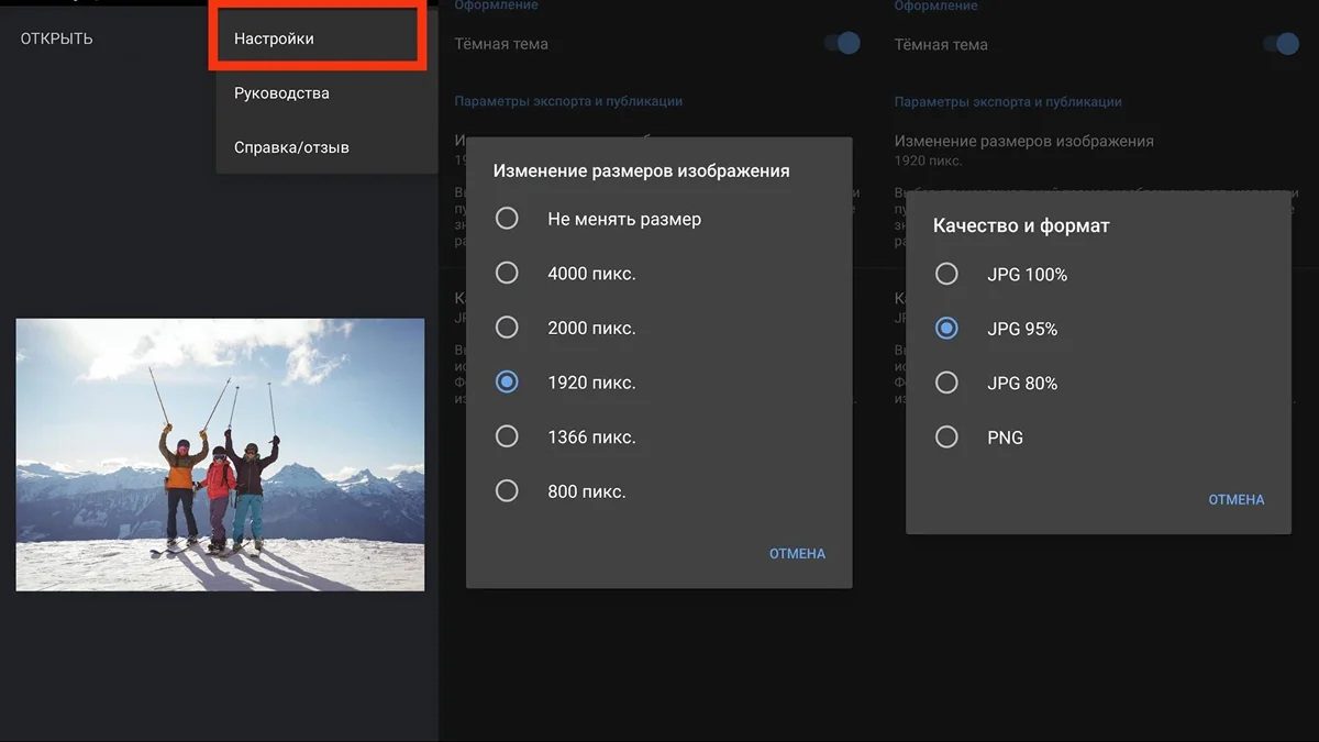 - изменение размеров изображения — от 800 до 4000 пикселей, либо сохранение в исходном варианте;