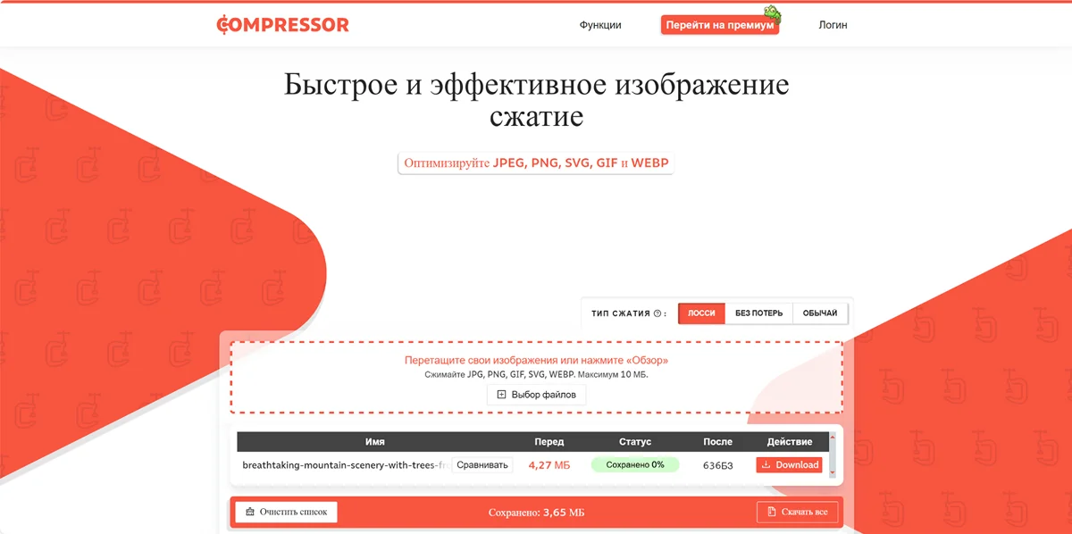 - несколько вариантов оптимизации — «Лосси» или с потерями качества, «Без потерь», «Эксперт»;